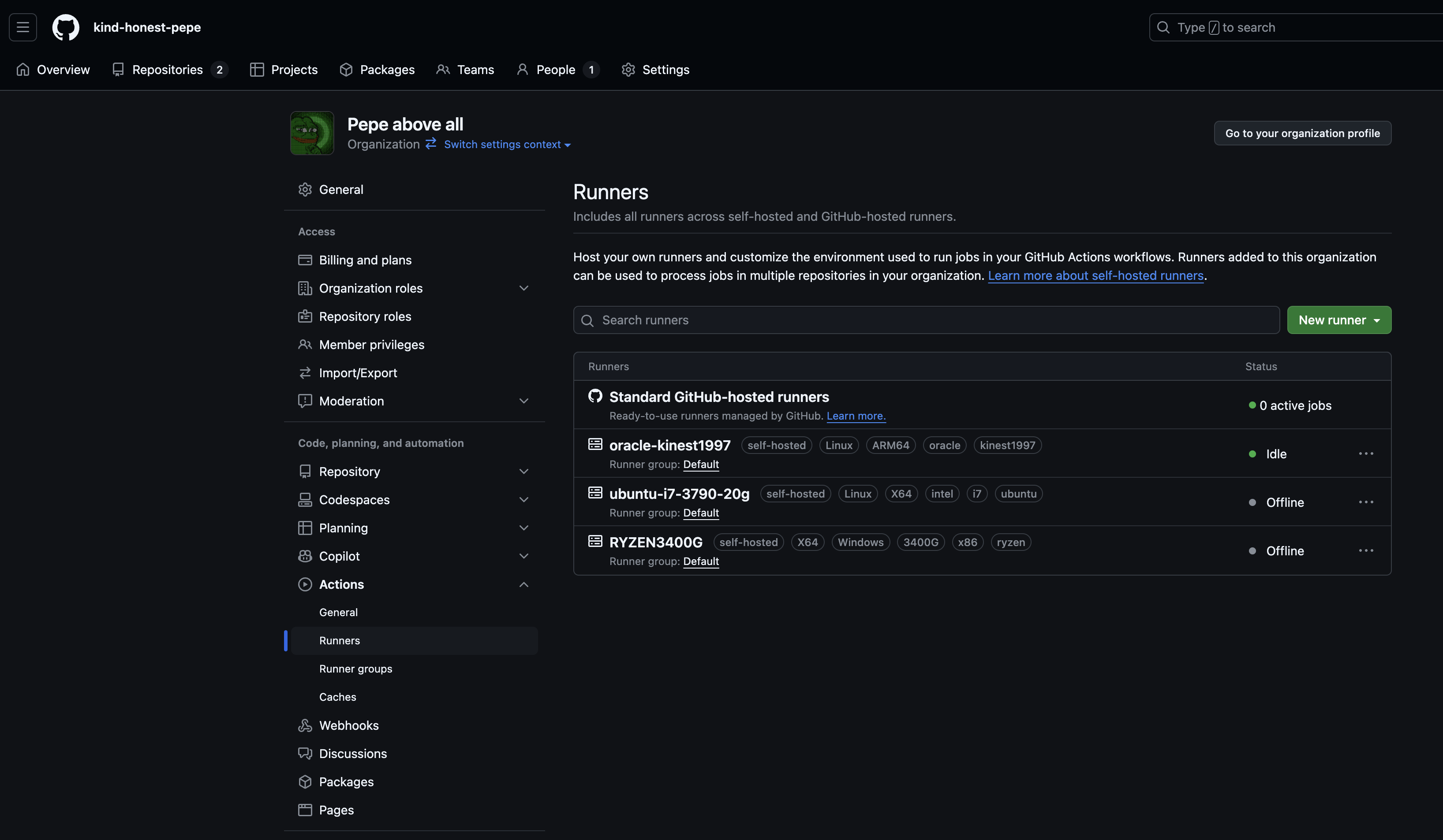 그러니 개인 프로젝트 할 때 self-hosted 하고 싶다면 Organization을 만들고, 거기에 레포를 생성해서 모든 레포가 사용가능하도록 해주자.